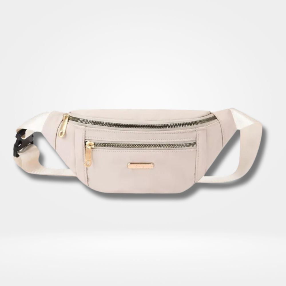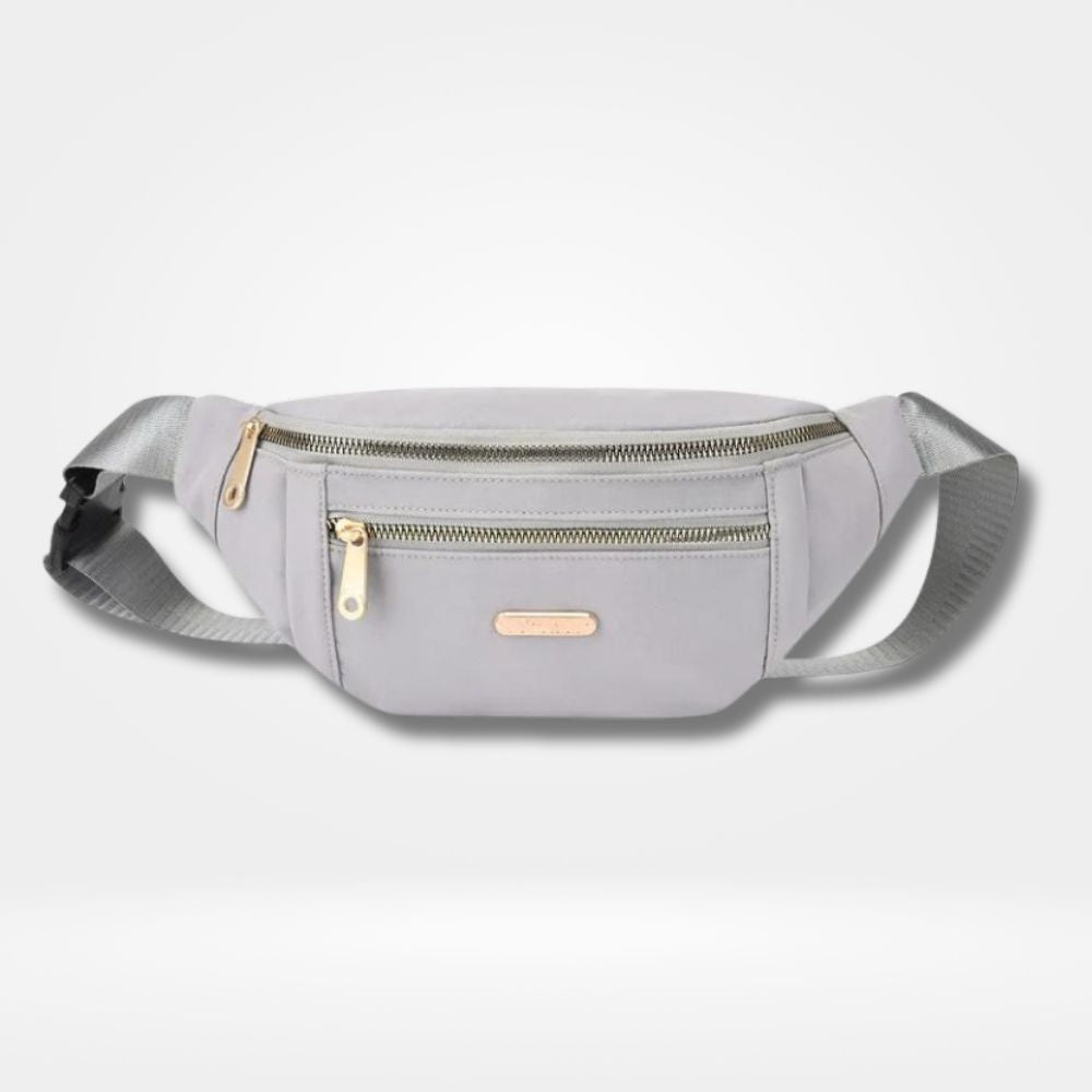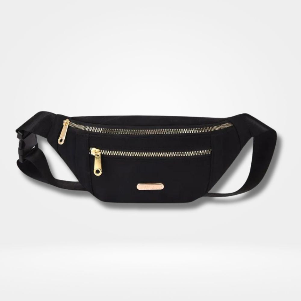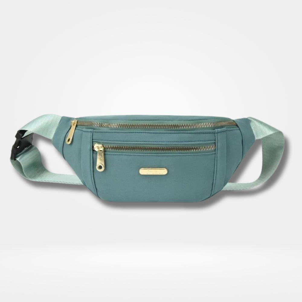 ac banane bleu femme avec 2 poches zippées dorées et sangle ajustable — sac pratique et élégant pour le quotidien, le voyage et les sorties